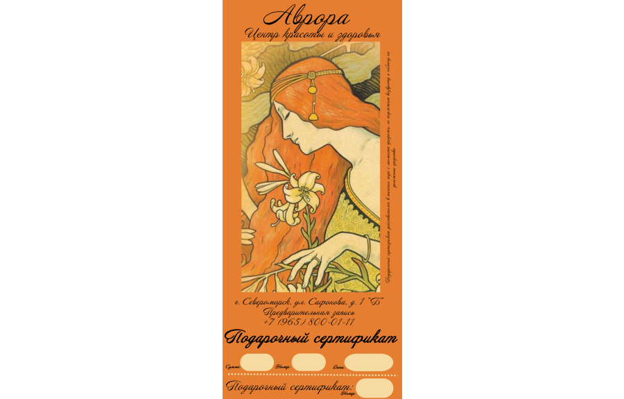 1. Сертификат и программа могут быть использованы Держателем Сертификата в целях приобретения товаров и услуг центра здоровья и красота Аврора.